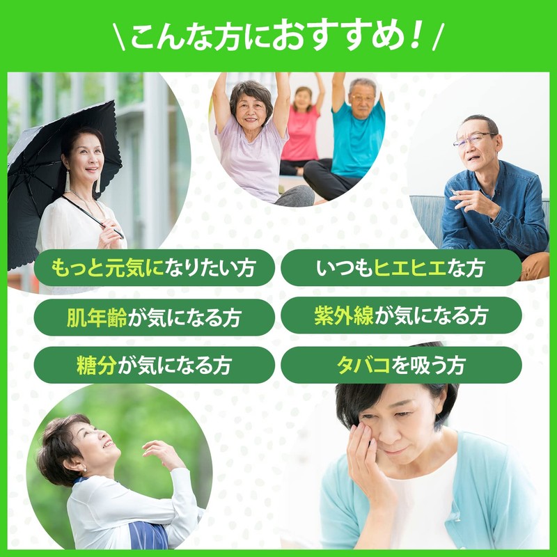 • 【手足のヒエや紫外線が気になる方に】肌年齢が気になる方、いつも手足がヒエヒエな方、紫外線が気になる方、タバコを吸う習慣を持つ方、食事が不規則な方、お酒や脂っこい食事が多い方、糖分や炭水化物が気になる方、いつまでも若々しくいたい方など。