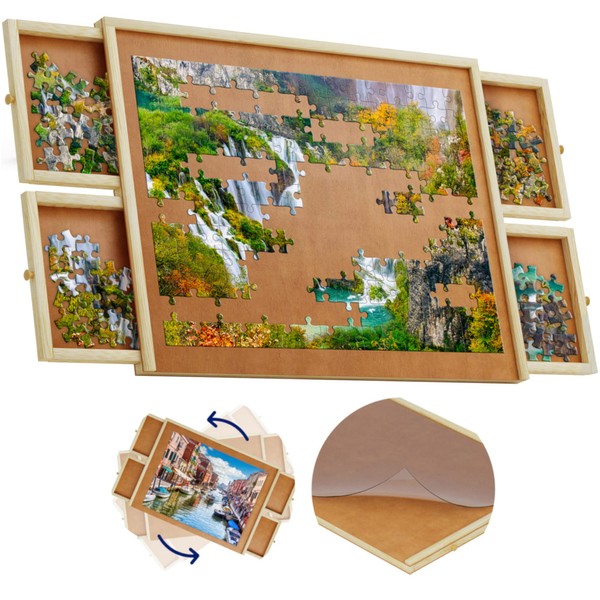 1500 Piece Wooden Jigsaw Puzzle Table - 4 Drawers, Rotating Puzzle Board | 35” X 28” Jigsaw Puzzle Board | Puzzle Cover Included - Portable Puzzle Tables for Adults and Kids by Beyond Innoventions