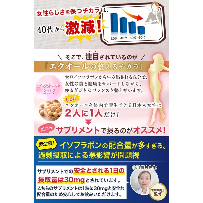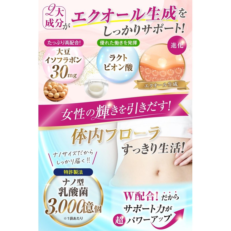 - 【大豆イソフラボンとラクトビオン酸のW配合で エクオール生成 をしっかりサポート】 大豆イソフラボンは女性のキレイに欠かせない「エストロゲン」に似た成分で、年齢とともに減少します。 40代以降のゆらぎ世代の健康と美容をサポートする成分として注目されているのが、大豆イソフラボン由来の成分「エクオール」です。 「エクオール」は大豆イソフラボンとラクトビオン酸の力を借り、変換されることで生まれます。 加齢により感じやすい体調変化、若々しい女性らしさを保つために1粒にたっぷり30mg配合、あなたに寄り添いサポートします。※サプリでの安全な1日の摂取量の上限値は30mgとされています。