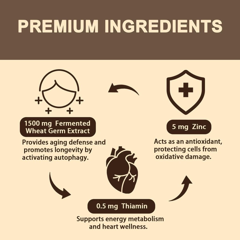 - Powerful Formula -Our unique liposomal spermidine formula, featuring 1500mg premium spermidine-rich wheat germ extract, thiamine, and zinc. Scientifically proven to activate cellular renewal through autophagy that benefit aging defense and longevity.