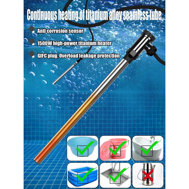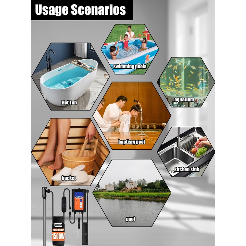 - 【 Versatile and Portable】This fully submersible water heater is highly versatile and suitable for a wide range of applications. It can be used in bathtubs, swimming pools, baptismal pools, SPA baths, livestock water troughs, buckets, aquariums,landscape pool and kitchen sinks. Its portable design allows for easy movement between different liquid environments, meeting your heating needs in various scenarios, whether at home or in commercial settings.