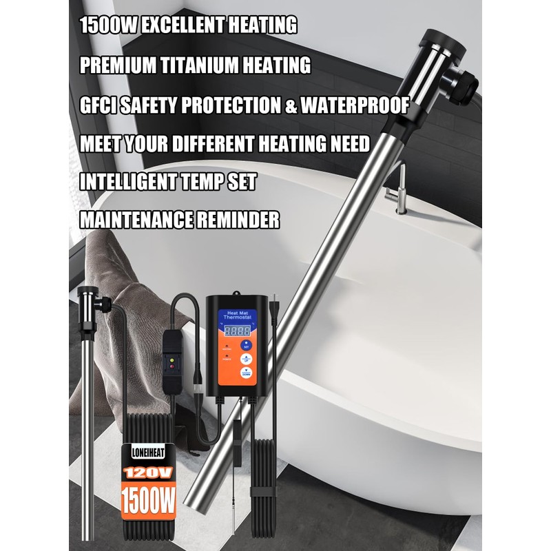 1500W 120V Titanium Fully Submersible Immersion Water Heater with LCD Thermostat & GFCI Plug - Ideal for Pools, Hot Tubs, Bathtubs, Baptistry & Saltwater