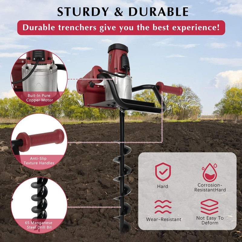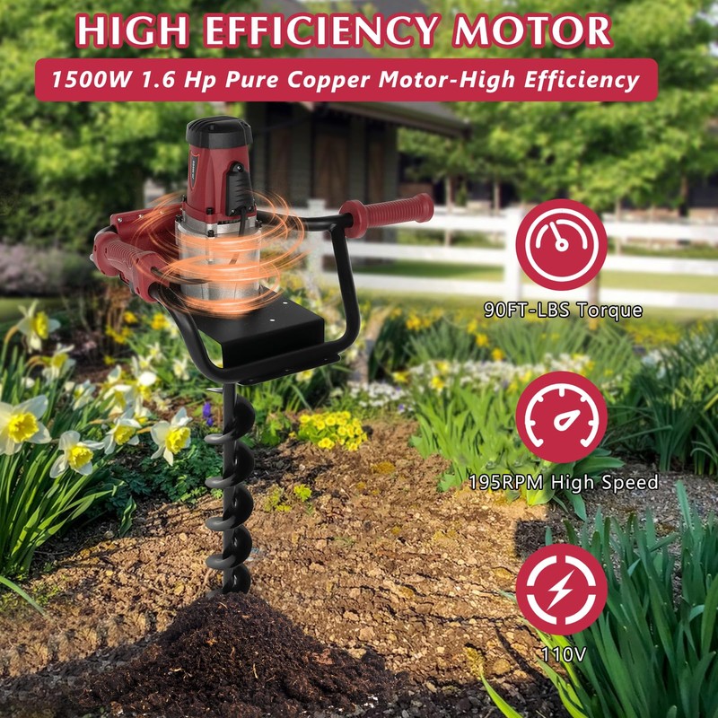 - Powerful Post Hole Digger: 1500W 1.6 HP pure copper motor with a high rotational speed (195rpm) and torque (90ft-lbs) enables multiple diggings in a quick succession manner and achieves fast drilling with low noise, thus providing excellent performance (27.56in maximum drilling depth).