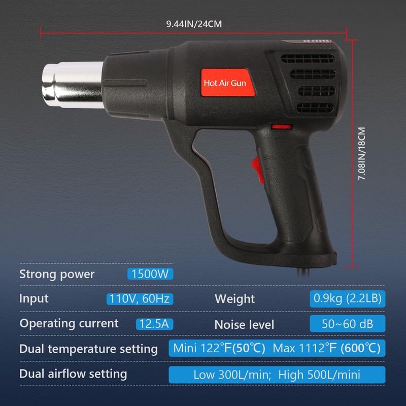 - [3-Temp Control] Our heat guns are adjustable with variable temperature control. The red, stepless temperature control rollers provide rheostatic heating and the high/low switch on the handle provides airflow control. 2 Temperature Controls, I: Temperature: Max 572°F / 300°C Airflow: 300L/M. II: Temperature: Max 1112°F / 600°C Airflow: 500L/M.