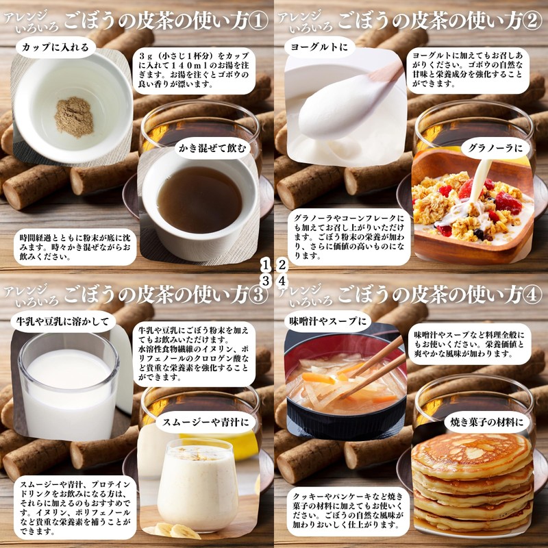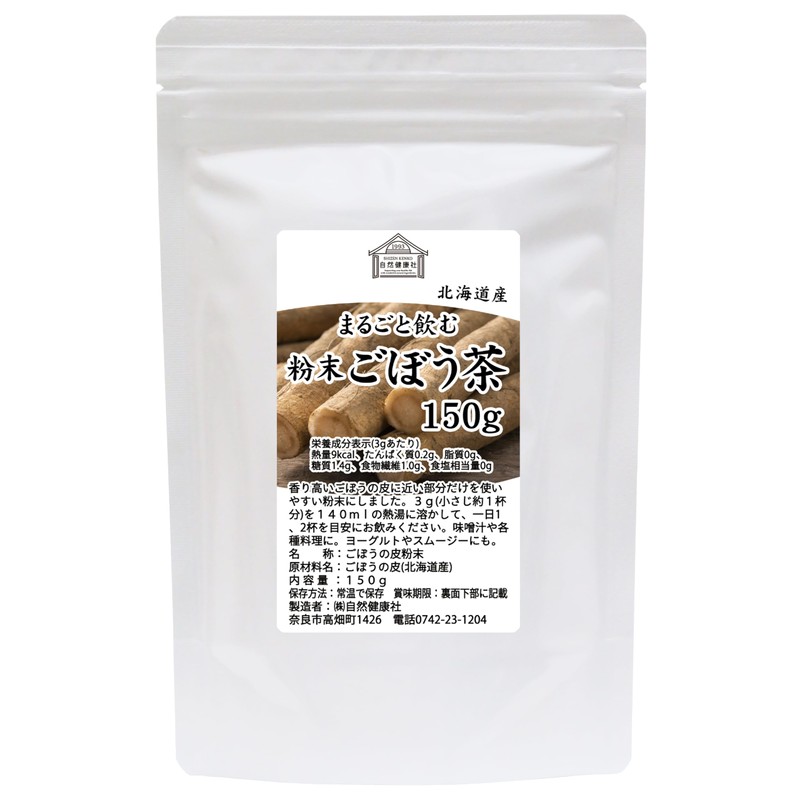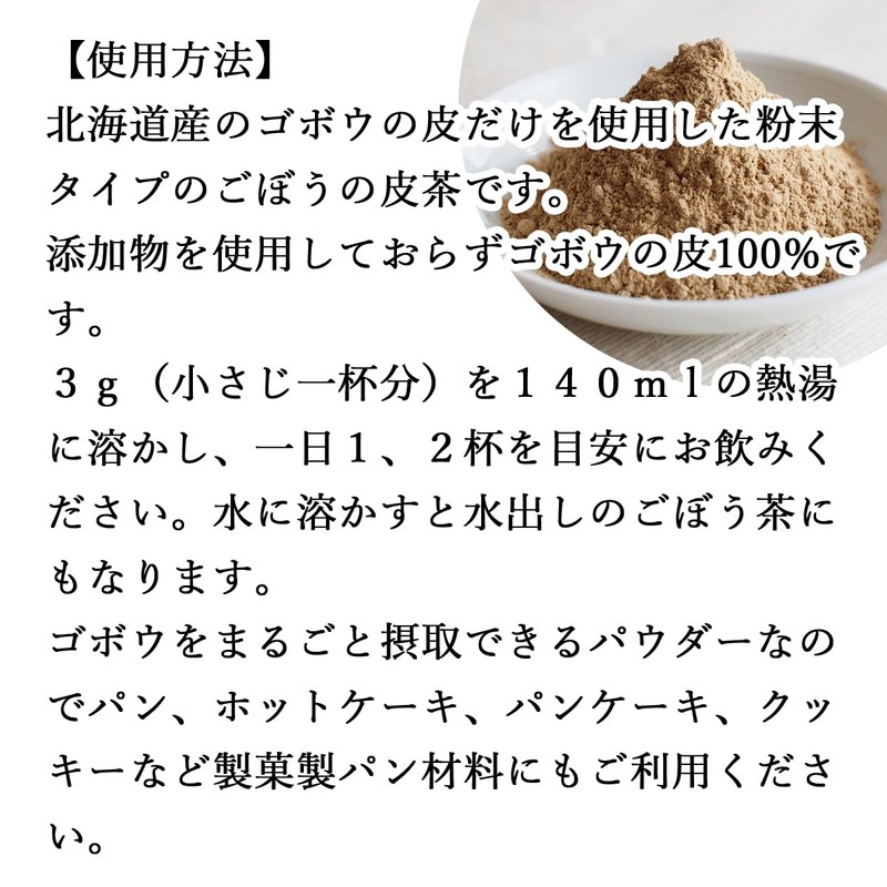 - 【使い方】国産(北海道産)のゴボウの皮だけを使用した粉末ごぼう茶です。形状はごぼう粉末(ごぼうパウダー)で粉末をお湯に溶かして飲用します。カフェインレス(デカフェ)なので妊娠中、授乳中、子供、子ども、お子様や就寝前にもおすすめです。3g(小さじ一杯分)を140mlの熱湯に溶かし、一日1、2杯を目安にお飲みください。ゴボウ粉末、牛蒡パウダーとしてみそ汁、味噌汁、スープ、ポタージュ、ヨーグルト、スムージーに。パン、ホットケーキ、パンケーキ、クッキーなど製菓製パン材料としてもご利用ください。