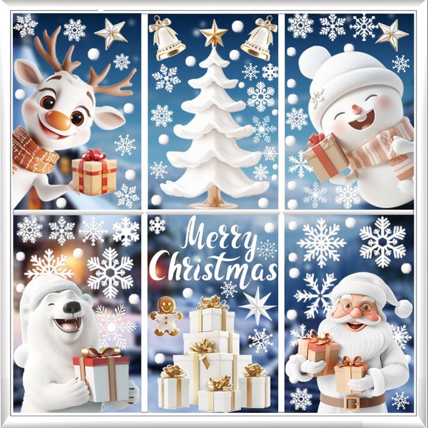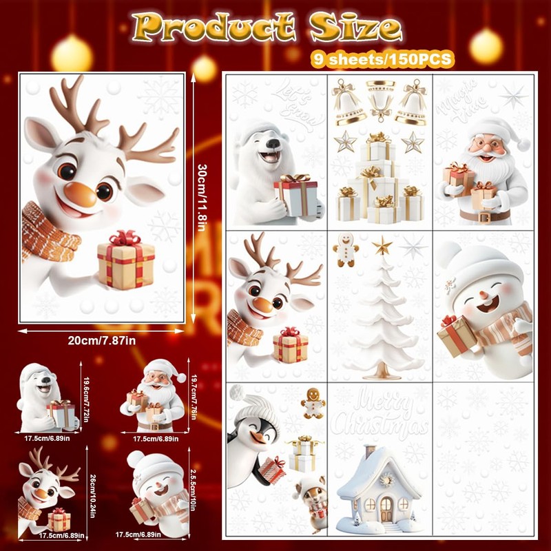 150PCS Christmas Window Clings, 9 Sheet Christmas Window Stickers Santa Claus Xmas Tree Snowflake Window Clings, Double Sided Stereo Static Window Stickers for Christmas Window Décor (Christmas-White)