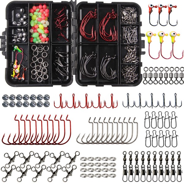 - Huge Variety: 150pcs fishing tackle kit comes in sensible blend, includes off-set hooks, bullet weights, jig heads, barrel swivels, fastlock snaps, fishing beads and space beans, suitable for all sorts of fishing conditions.