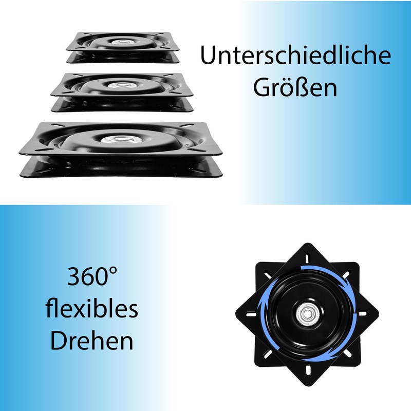 • This turntable is a practical component that allows even heavy objects to be rotated comfortably and precisely. The turntables are ideal for seats in the caravan or on the boat, sales stand at the POS. However, there are no limits to your imagination.