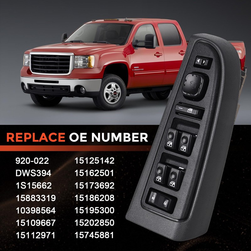 • Replaces Part# - 15883319, 920-022, DWS394, 1S15662, 10398564, 15109667, 15112971, 15125142, 15162501, 15173692, 15186208, 15195300, 15202850, 15745881.This master power window switch perfect replace the factory switch on car, installation can be completed under 30 minutes.