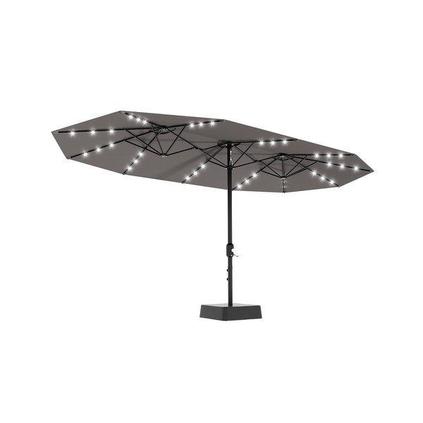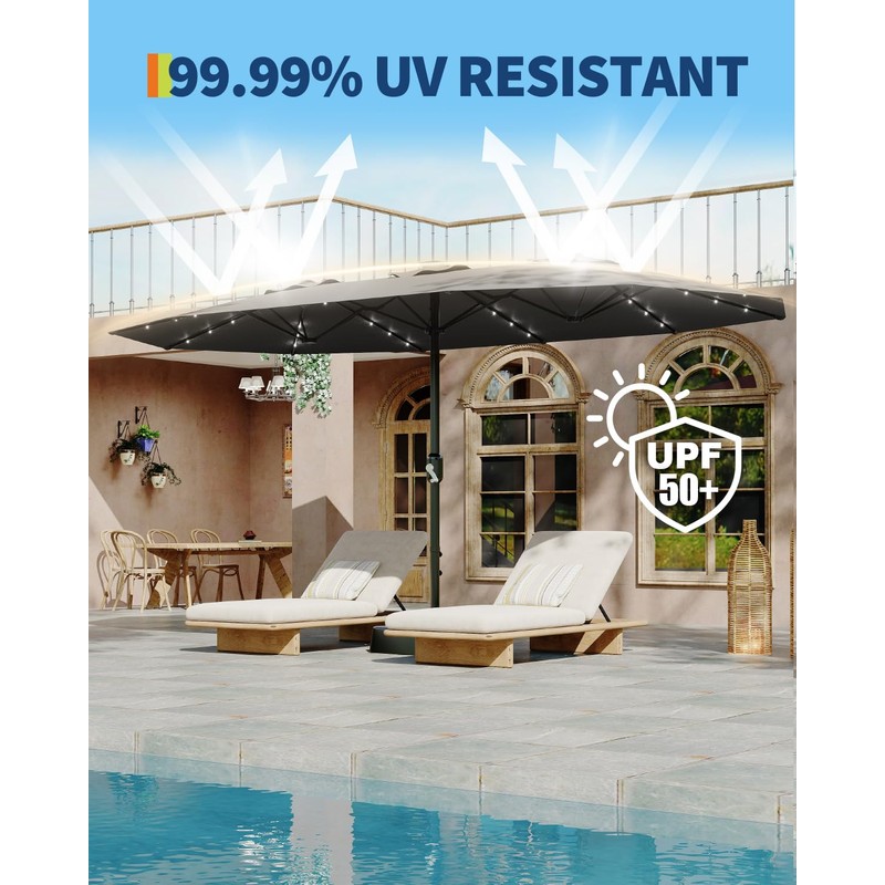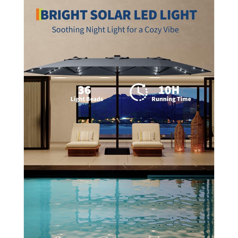 15FT Large Patio Umbrella with Base and Solar Lights, Double-Sided Rectangle Umbrella Oversized Shade for 8-10 People,36 LED Lights and Weighted Base for Pool, Deck, Backyard,Grey