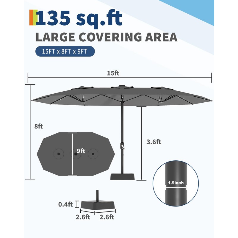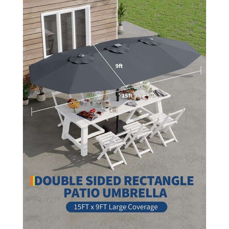 - Extra Large Coverage: The 15 x 9 ft extra-large double-sided patio umbrella offers a generous shading area of up to 135 sq ft when fully open. It can be used with 4-8 person patio dining set or outdoor furniture set, ensuring maximum sun protection.