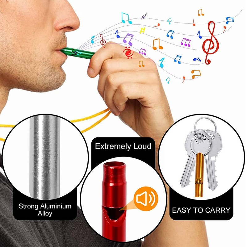 - Very Strong Survival Whistle An emergency whistle can deliver up to 100 decibels, enough to be heard over long distances.