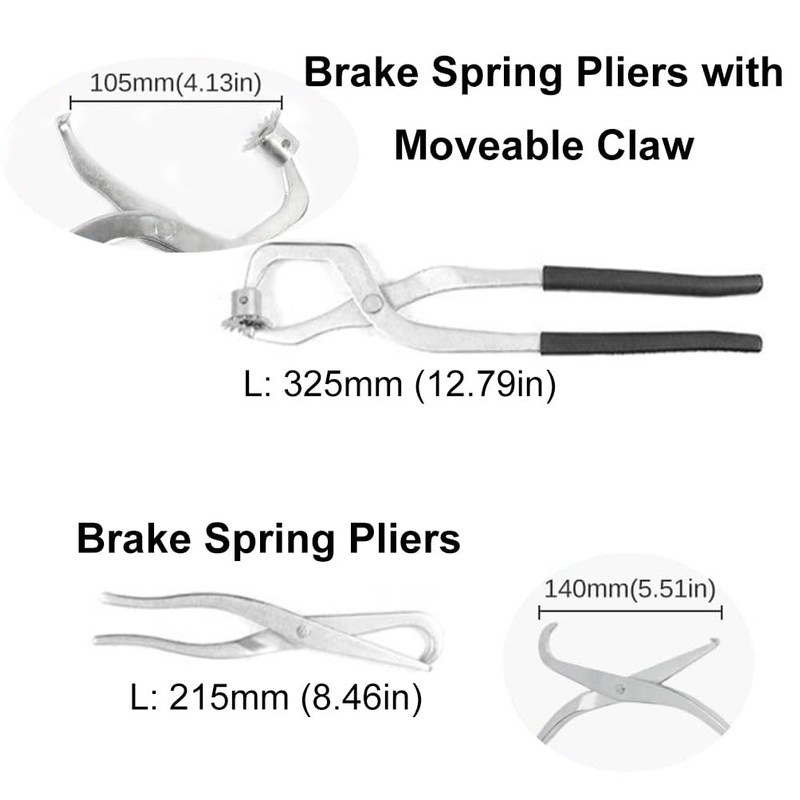 Brake Spring Pliers with Moveable Claw used to remove and install the brake shoe springs, and Brake Spring Pliers used to install and remove the brake shoe return spring on riveted brake pad