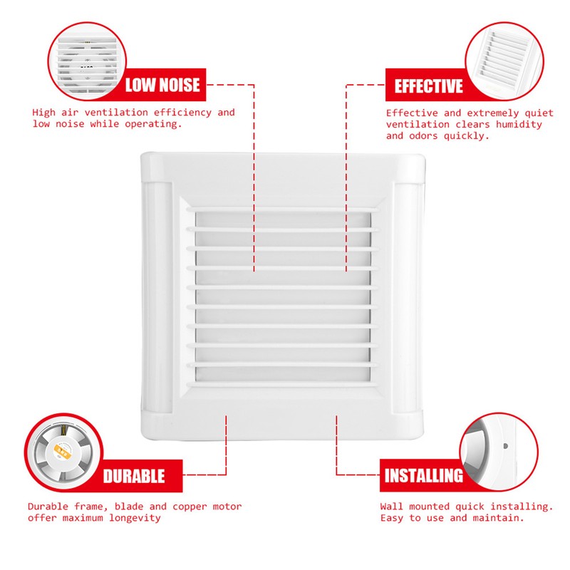 Wall mounted exhaust fan widely used at home bathroom, toilet, kitchen, garage and so on. It features with high work efficiency, low noise and long service life. With modern and simple design, the whole shell and blades are durable and sturdy.