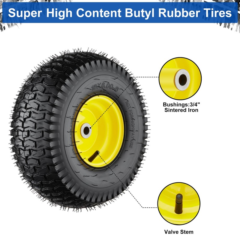 - 【Superior 15x6.00-6nhs Lawn Mower Tires】Tire diameter: 15”, Tire width:6”, Rim diameter: 6”,Hub. Offset:3.5”, Bore ID:3/4”. Tire type:4 Ply Pneumatic(High-content butyl rubber inner tube), Max. load capacity: 570 lbs, Not for highway use.