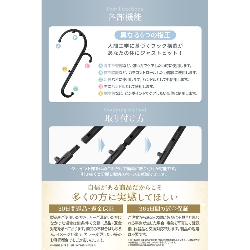 - ✅【全16パターンのセルフケア!これ一本で全身のツボ押しを】姿勢は変えずにボディフックの向きを変えるだけで首、肩、腰、太もも、足裏まで突起が身体をグイッと指圧。S字構造であらゆる部分に突起を配置、今ままで届かなかった背中や肩甲骨のツボにも誰でも簡単に届き、凝りをほぐします。これ一本で16通りのセルフケア方法がわかる説明書付きなので、お子様から老人の方まで誰でも簡単に使えます。力加減ももちろんお好みに調整が可能。整体師のような指圧をご自宅で体験ください。