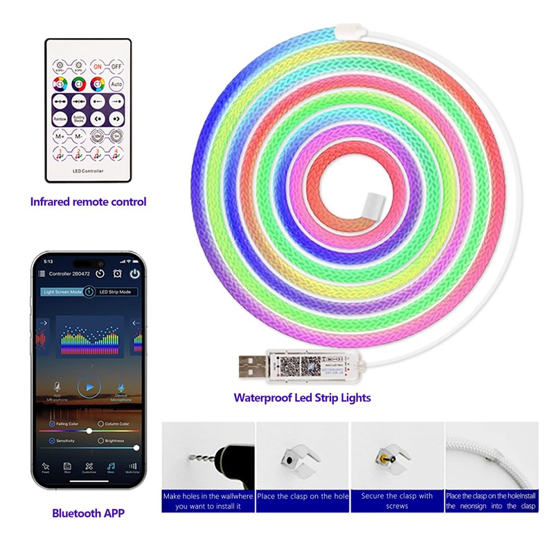 - [Music synchronization and timing function] The built-in microphone can synchronize with any sound, music, and game audio and respond in real-time. The two control methods of APP and remote control can be mixed into 16 million different colors. The DIY music mode displays multiple colors of light simultaneously in the bendable neon light strip, creating a music and color feast, making it an ideal choice for gatherings, holidays, and celebrations. Through the timer function of the APP, you can preset the time for the LED lights to automatically turn on and off, making life more convenient.