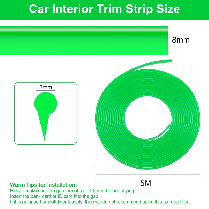 - đăInterior Strip SizeăBOAOSI Car interior moulding trims size : length :16.4 ft / 5 meters, thickness: about 0.04 inch. Please make sure the gap trim of car (1-2mm) before buying. Insert the bank card or ID card into the gap. If it is not insert smoothly or loosely, then we do not recommend using this car gap filler.