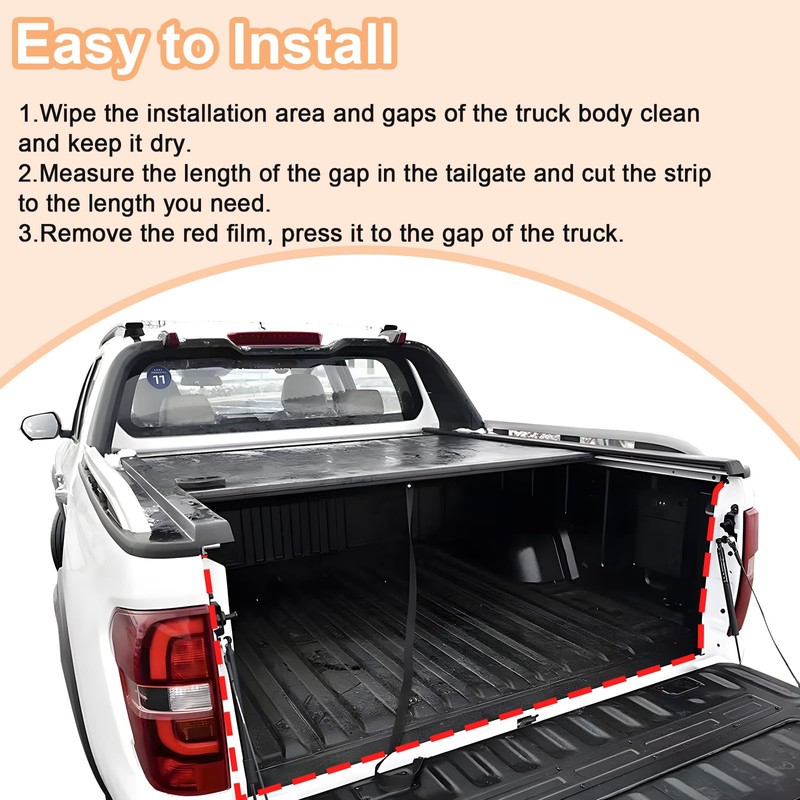 - Easy Installation:The Truck Cap Seal with a strong adhesive backing to make it easy to install.【1】Clean the gaps of the truck and keep it dry.【2】Tear off the red film and press it into the truck gap, minus the excess.【3】For a better adhesion, do not allow it to get into water for 3 days. It is recommended to use a hair dryer to heat it up to make it bond more firmly