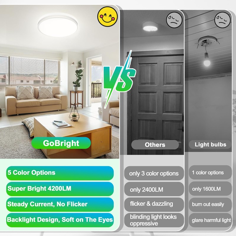 - 【Budget-friendly—Lower Your Monthly Electric Costs】Our high-performance LED technology provides 3200 lumens of flicker-free brightness while using only 24W of power—90% less energy than a 240W six-bulb (40W each). Enjoy high brightness with minimal energy use. When choosing LED ceiling lights, opt for lower power consumption and higher brightness instead of higher power and higher price. GoBright is the smart, cost-effective choice!
