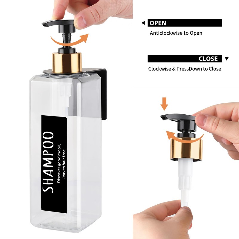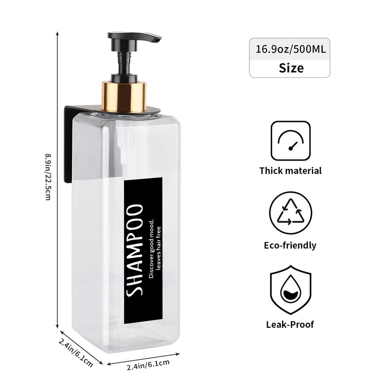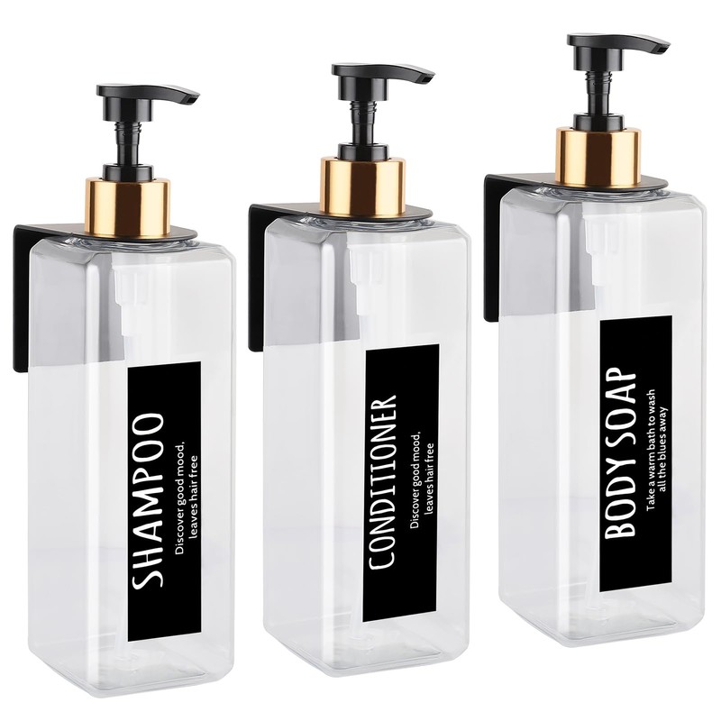 - What you will get: 3 500ml PET soap dispensers, 12 waterproof label papers (shampoo, hand sanitizer, shower gel, conditioner, multi-purpose cleaner, disinfectant), 3 black stainless steel wall brackets, an additional bamboo and wood pump head, and 4 3M adhesive tapes. It is very suitable for shampoo, conditioner, bath gel, lotion and other liquid care products.