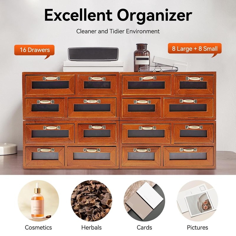 - [Built to Last] This desktop 16 drawer organizer is made of sturdy solid wood and iron, which is strong and durable.