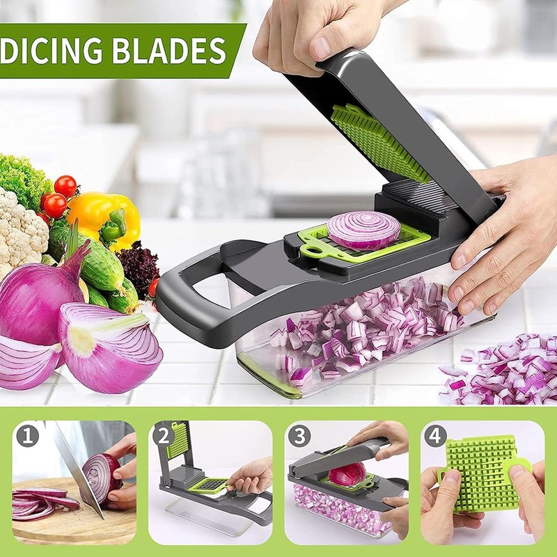 • 【Easy to clean】vegetable chopper slicer dicer Completely removable, simply scrape off any residue from the tray and blades using the cleaning accessories included with the set and rinse with water. Once thoroughly cleaned and dried, the blades are stored in a container to prevent leakage and damage. Note: Do not touch the cutting position with your hands when cleaning and keep out of reach of children.