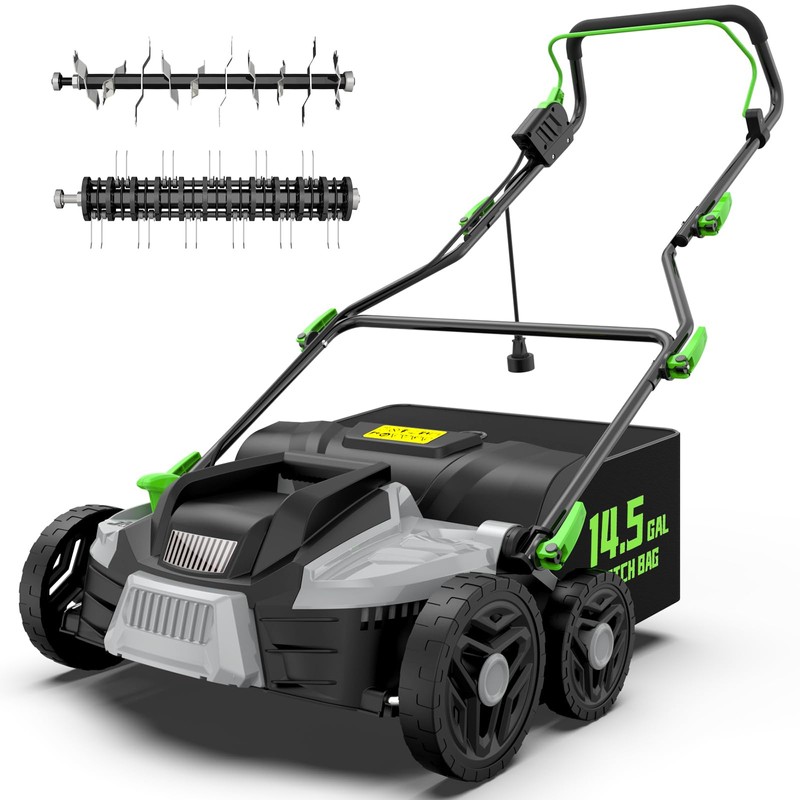 TIECTOWN 16-Inch 15.5 Amp 2-in-1 Electric Dethatcher and Scarifier with 14.5-Gallon Removable Thatch Collection Bag, Lawn Dethatcher with 5-Position Depth Adjustment, Quick-Fold, Keeps Lawn Healthy