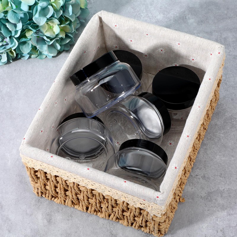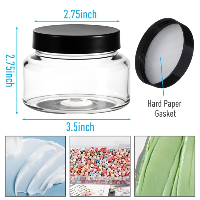 • Elegant low profile sample jars with stable bottom, attractive see-through transparent jars display your contents. Cosmetic containers can also be stored on a shelf or displayed for promotional goods and item re-sale.