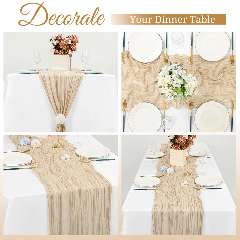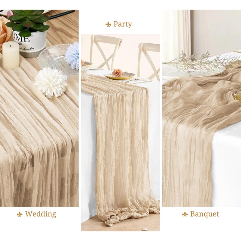 - 【Suitable Size】You will receive 16 pieces 13ft length Beige cheesecloth table runner with wrinkled texture, enough quantity is suitable for wedding banquets and various parties, Each tablecloth measures approximately 35 x 157 inches/90 x 400 cm and appropriate for round or rectangle tables that can seat 12-14 people. The elegant table runner can meet your needs for table decoration adds a romantic atmosphere to your wedding or special events.