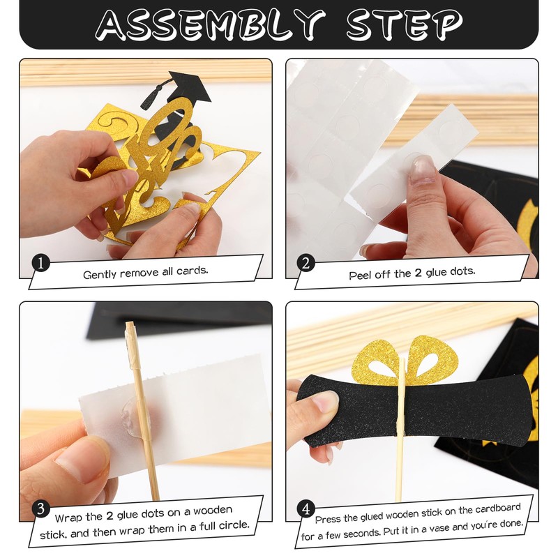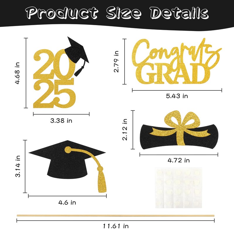 - What You Will Get: Premium 16 piece graduation centerpieces, including 4 different iconic shapes like caps, diplomas, "2025" with caps, "Congrats GRAD". 16 pcs wood stick and 40 glue dots.