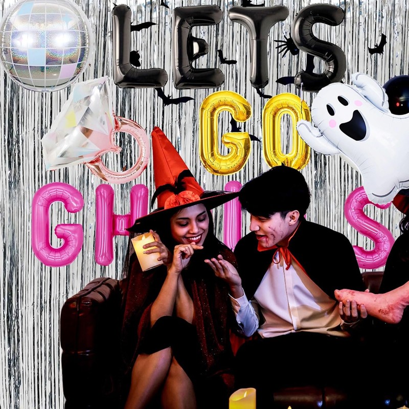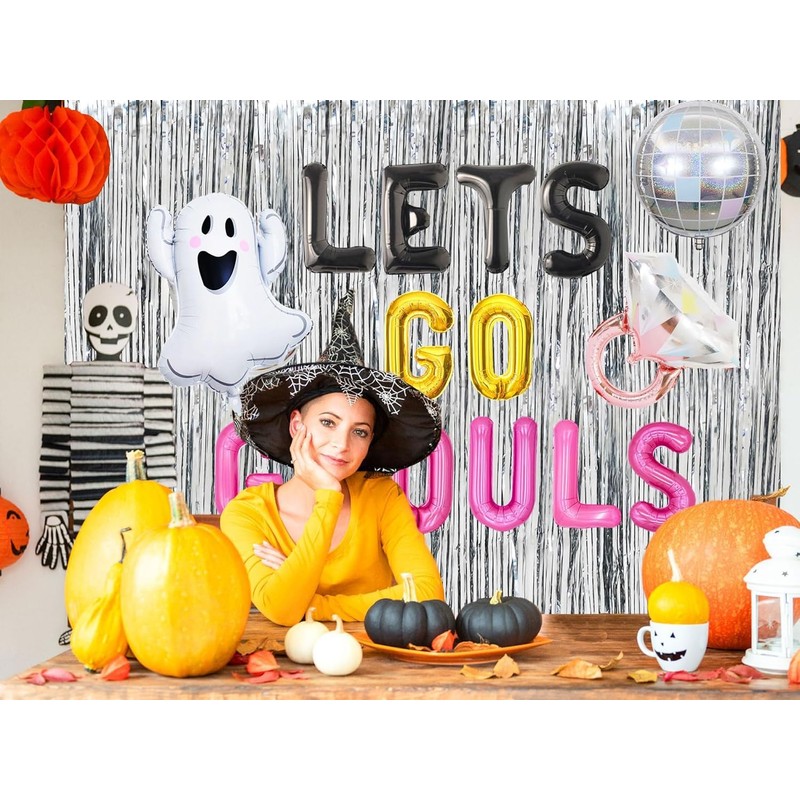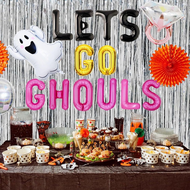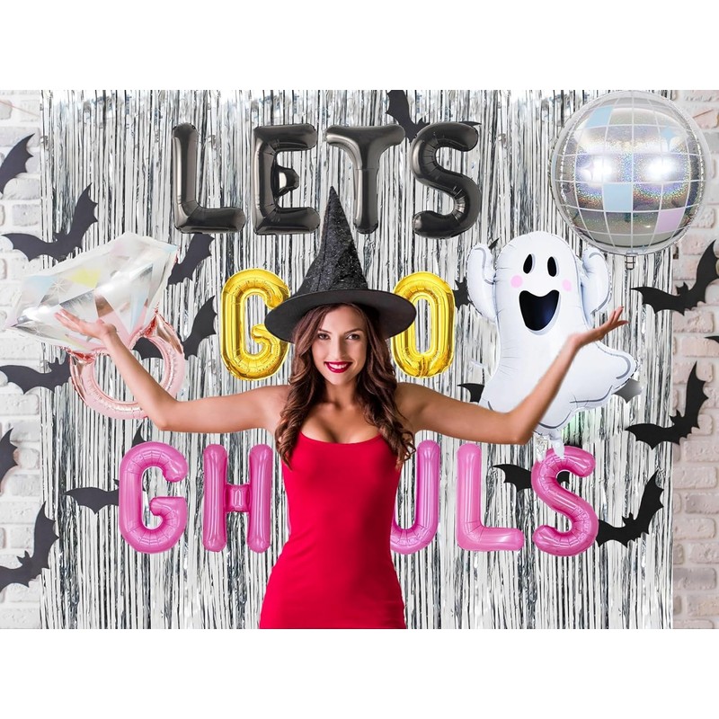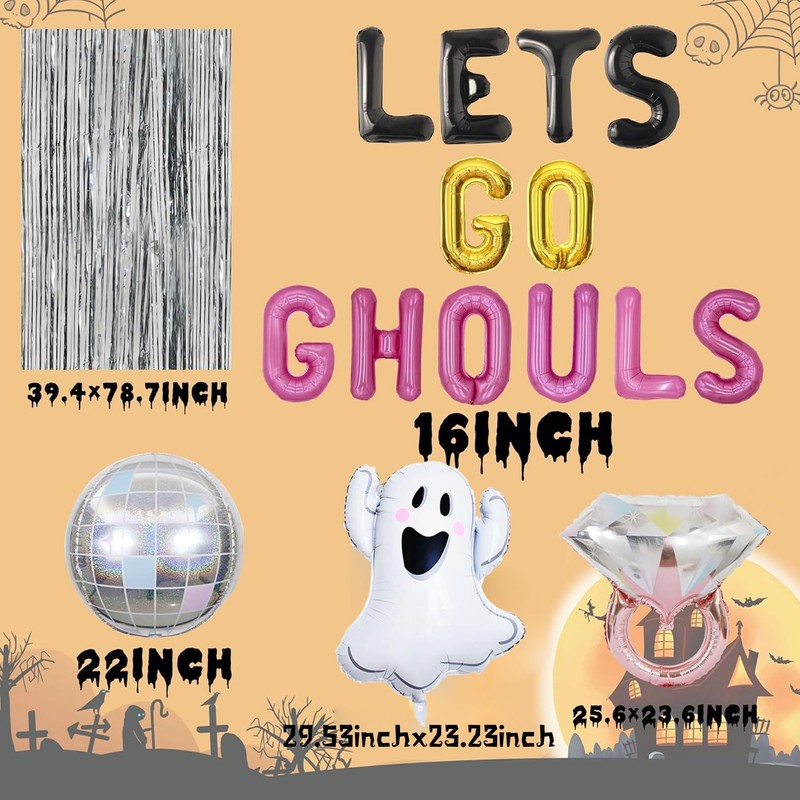 - You will get: 1 x Lets Go Ghouls letter balloon, 1 x pink ring balloon, 1 x Ghouls balloon, 1 x silver disco balloon, 1 x silver rain curtain