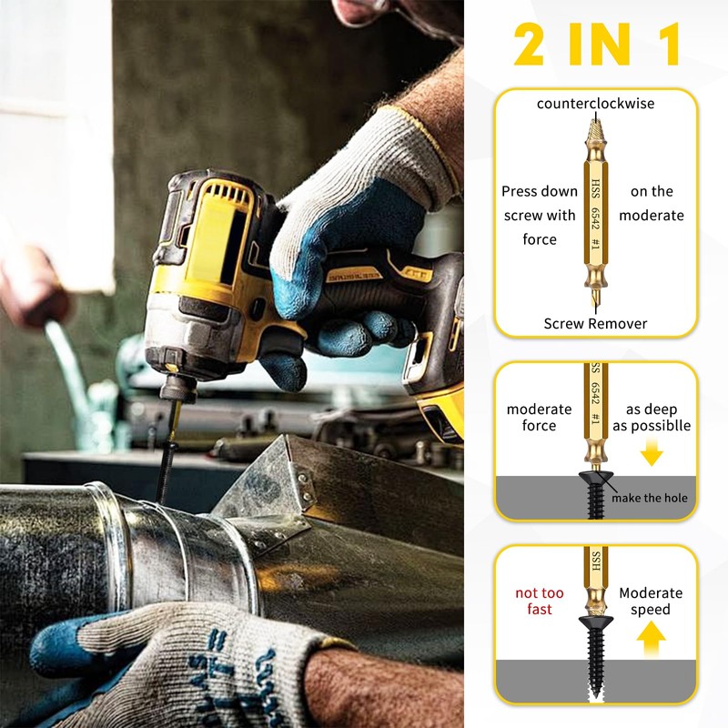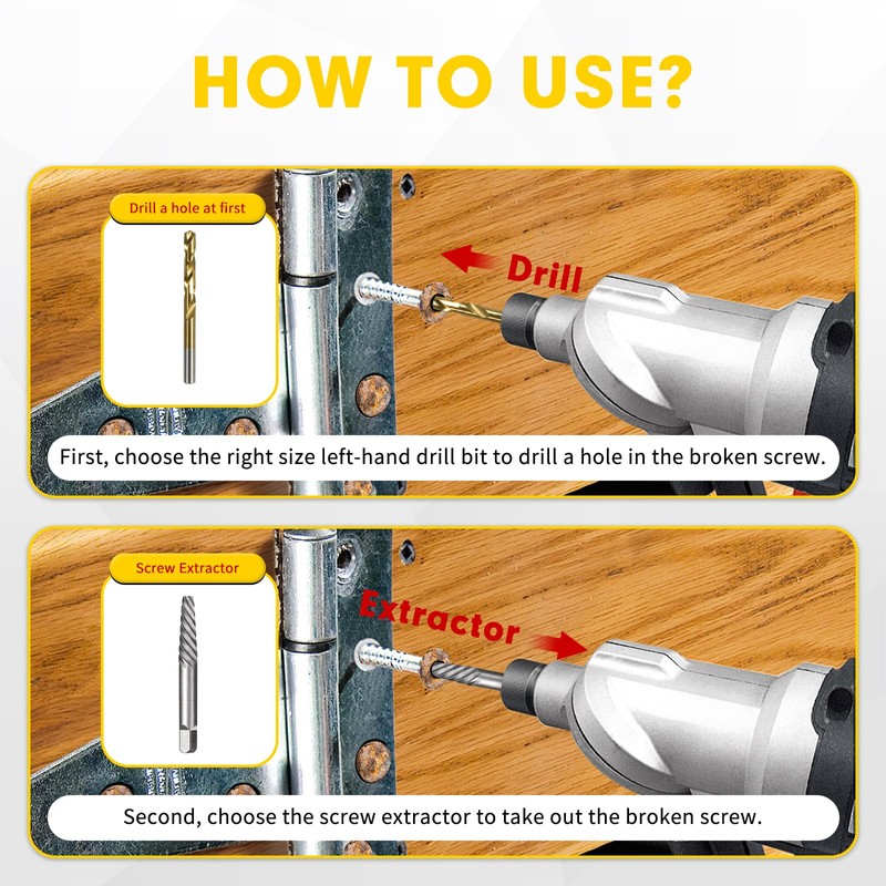 - How To Use:Use the screw removal head to counterclockwise drill holes in the broken screws(or professional twist drill bit clockwise drill holes in the broken screws),Convert screw remover head to screw extractor head after creating hole,Use the screw extractor head to take out the broken screw, This easy out screw extractor set makes screw extraction simple and efficient, even for beginners