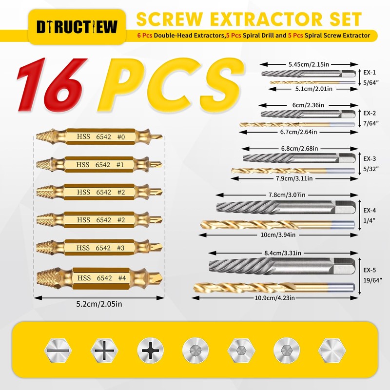 - Comprehensive Size Selection: Our 16 PCS stripped screw extractor set offers an extensive range of tools for removing damaged or stripped screws. It includes 6pcs HSS 6542 double-head extractors (#0, #1, #2, #3, #4, #5), 5 pcs spiral drill and 5pcs spiral screw extractors (5/64"",7/64"",5/32"",1/4"",19/64"") to cover all your screw removal needs