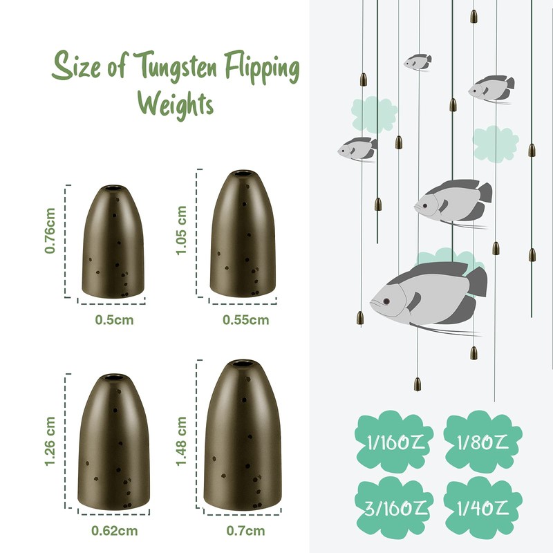 - Delicate design: the delicate design makes the tungsten flipping weight hard and easy to drop; The tungsten flipping weight has no burr inside the hole so that wires or fishing lines can pass through easily without creating brittle lines; The shape of the weight can reduce the possibility of tangling with rocks, and likely reduce drag