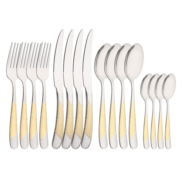 16-Piece Flatware Silverware Set, Uniturcky Silver 18/0 Stainless Steel Cutlery Sets with Gold Handle, Multipurpose Use for Home, Kitchen, Restaurant, Hotel Tableware Utensil Service for 4