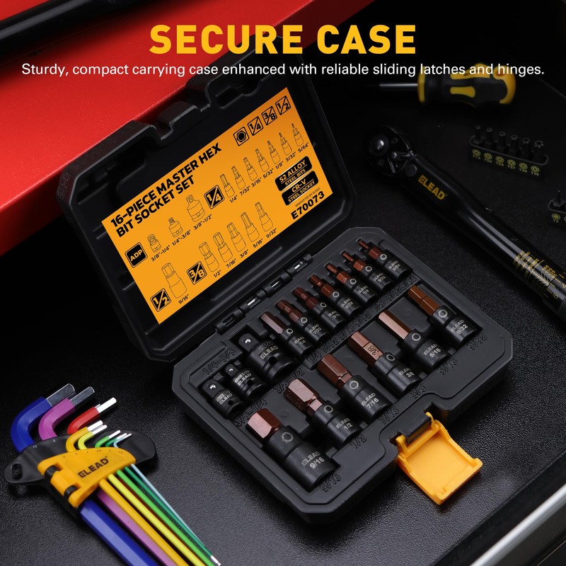 - Multi-size Coverage – This 16-piece set covers all your needs, including 1/4" drive (5/64”, 3/32”, 1/8”, 5/32”, 3/16”, 7/32”, 1/4”), 3/8" drive (9/32”, 5/16”, 3/8”, 7/16”, 1/2”), and 1/2" drive (9/16”), plus 3 socket adapters. Each socket features a detent pin hole for added stability and precision.