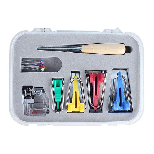 - Bias Tape Set - Included 4 x Bias Tape Makers (Green 1/4", Yellow 1/2", Red 3/4", Blue 1") + 1x Bias Binding Foot + 1 x Awl + 10 x Ball Point Straight Pins.
