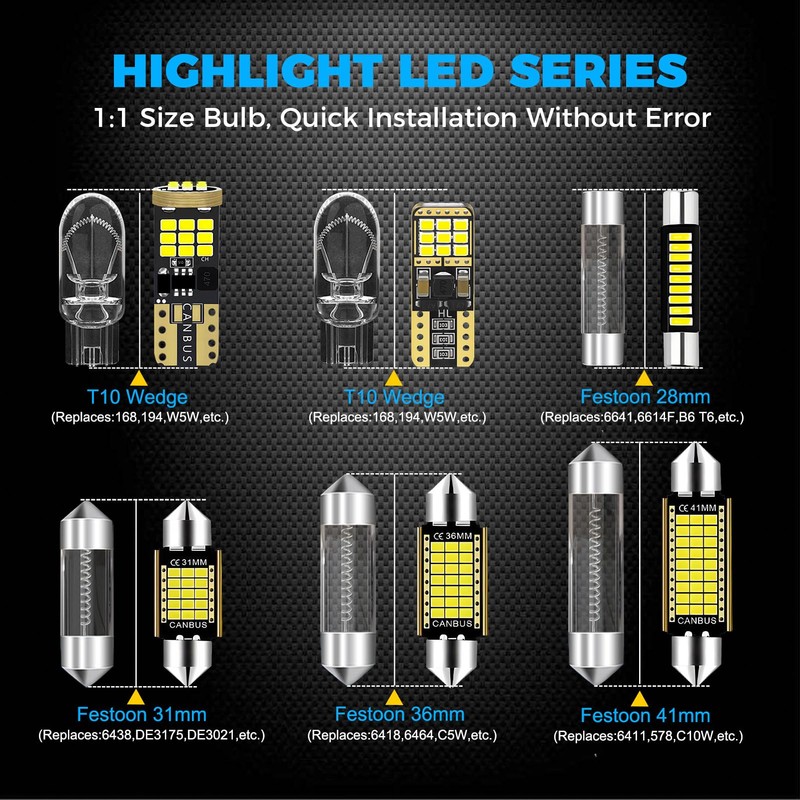 • EASY INSTALLATION: Aenvtol LED Bulbs are Almost 1:1 in Size with Regular Halogen Bulbs, Ensuring that They Can Fit Perfectly Into Your Car, Plug and Play.There Are a Bunch of Different Bulbs In The Kit. Each Light Package is Labeled for Where The Lights Go In The Vehicle,Easy to Install with Our Included Installation Tool.