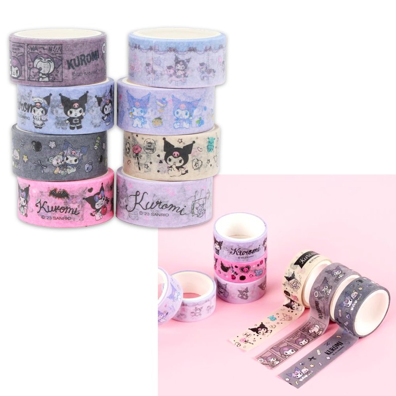 - This Sanrio stationery supplies kit comes with 16 rolls of washi tape, each measuring approximately 15 mm and featuring colorful artwork of Kuromi and My Melody.