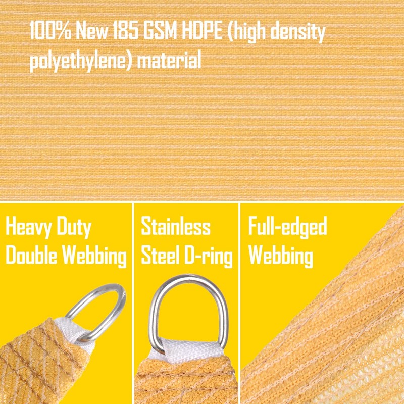 - High Quality Material: Our sun shade sail are made of 185 GSM 100% Non-recycled HDPE material that shines a little bit in the sun. Our sun shade sails also include sturdy polyethylene ropes to facilitate installation.