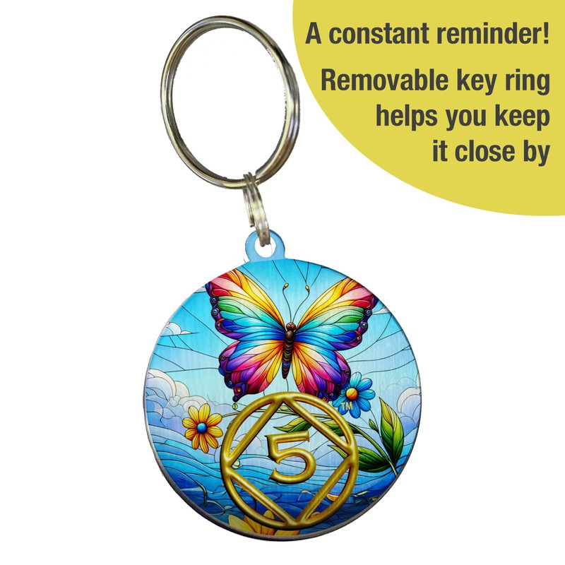 Features a colorful stained glass effect Butterfly with NA logo and Clean Year. Comes in a classic cloth bag with gift tag message. Suitable for clean and sober anniversaries, encouragement, sponsor and sponsee gifts or sobriety milestone