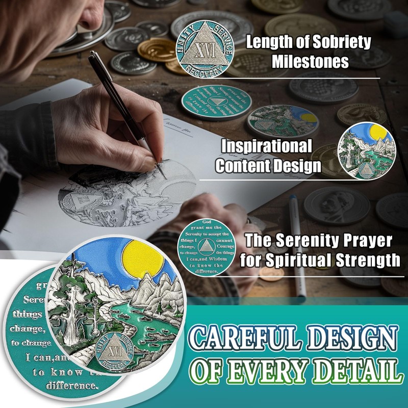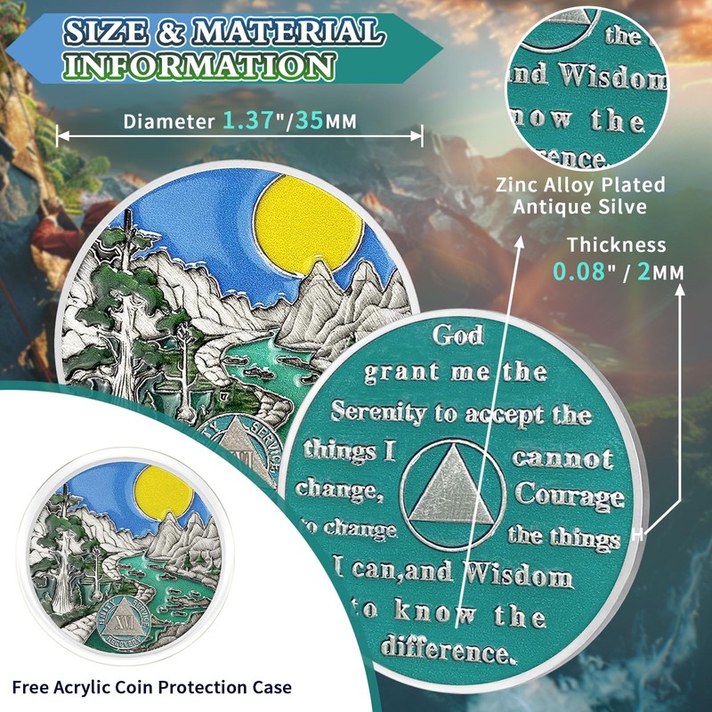 - Exquisite Front Design:“Unity, Service, Recovery” are the three mottos of the AA organization. Uniquely designed beautiful flowing nature motif with trees, mountains and the sun in the background. Roman numerals indicate the length of sobriety. The obverse of this sobriety coin shows a magnificent sunrise scene with the sun rising over the side of a mountain and a canyon full of vibrant trees, symbolizing new beginnings and hope