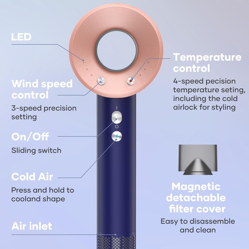 - Built-in overheating, overcurrent protection, high-density filters, and a fire-resistant frame, these settings can ensure the safe use of the hairdryer.with two 360° rotating magnetic nozzle. The advanced design is easier to use and change.