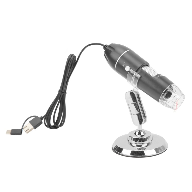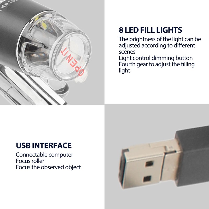 1、1600X Magnification: 640 x 480, 1920 x 1440 resolution, you will observe a high resolution, bright image. Fine antiskid focusing pattern, accurate positioning, 50X‑1600X adjustable magnification according to the observed object. 360 degrees rotation, easy to adjust the viewing angle, free your hands. 2、8 Adjustable LED Light: 8 LED lights provide excellent detail and optimal clarity. You can adjust the brightness and color temperature of the light according to different scenes. 3、USB Microscope: USB interface, equipped with USB to type C adapter, suitable for Android mobile phones, laptops, compatible with mainstream operating systems. 4、Taking Photo Or Video: You can save the content you see under the digital microscope in the form of pictures or videos and share it with family and friends. 5、Wide Applications: Can be used in electronics, industry, beauty, scientific research and other fields, suitable for insects, plants, skin observation, industrial testing, circuit board testing, knitwear testing, etc. It is a good helper for students, electronic engineers, beauticians, doctors, curious children, etc.
