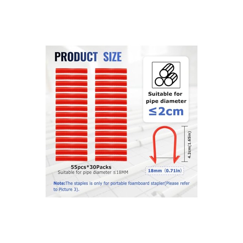 - 【PARAMETER】-- The foamboard staples’ length is about 1.65 inches(4.2 cm), which is suitable for pipes up to about 0.71 inches(18mm).
