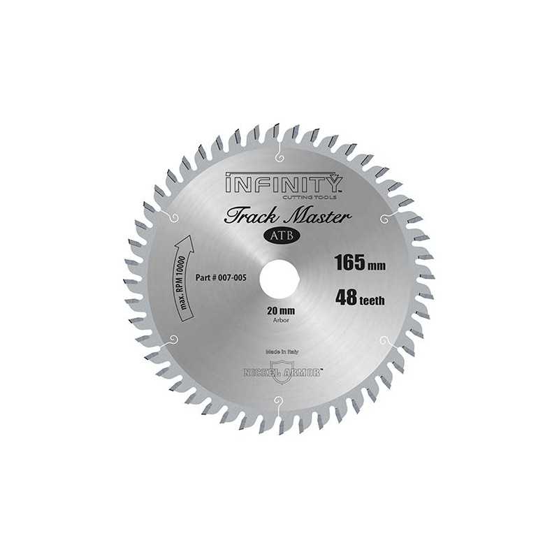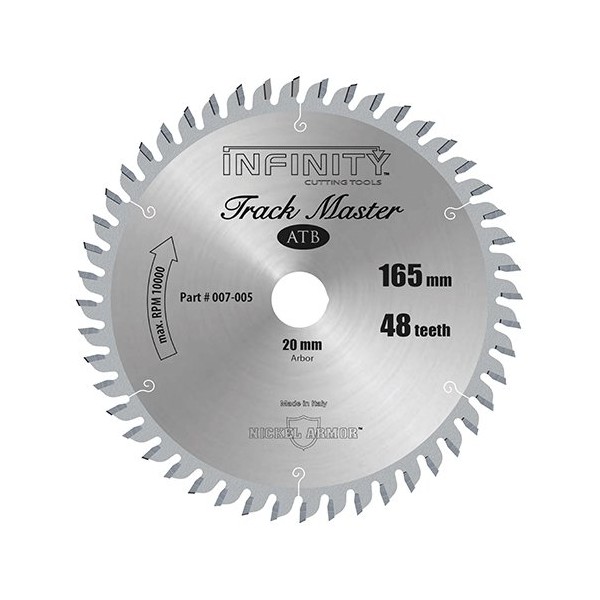 Infinity's 165mm Track Master Saw Blade Every woodworker knows that a saw is only as good as the blade inside it. So if you're running anything less than an Infinity Cutting Tools Track Master Blade in your track saw, then you're not cutting as well as you could be. Here are three reasons to upgrade your track saw with an Infinity Cutting Tools Track Master Blade: These 48 tooth blades are engineered to have a high degree Alternate Top Bevel (ATB). This new angle on the knife-like cutting edge is not only going to give you an amazingly smooth cut on laminate materials and cross cutting applications, it's also going to prolong the life of your blade by giving you more carbide to work with when you send it out for sharpening. We use the hardest C4 micrograin carbide avilable for the teeth of these Track Master blades, which last an average of ten times longer than conventional saw blade teeth. That hardness is necessary when you consider the kind of work you'll be doing with your track saw. Plywood laminates and other sheet goods are held together with all manner of glues and resins which can quickly dull a lesser grade of carbide tooth. Infinity Cutting Tools Track Master blades are constructed by the same manufacturing process that has created our entire line of award- winning table saw and miter saw blades. From the laser cutting process on our hot-rolled steel, to the special induction brazing of our teeth, each and every blade is a work of industrial art.