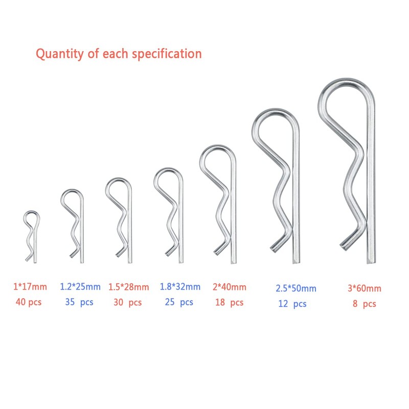 • 【Package included】R type kit includes 40Pcs M1*17mm, 35Pcs M1.2*25mm, 30Pcs M1.5*28mm, 25Pcs M1.8*32mm, 18Pcs M2*40mm, 12Pcs M2.5*50mm, 8Pcs M3*60mm ,A total of 168PcsR type split pin clips, many varieties and specifications, to meet your diverse needs;