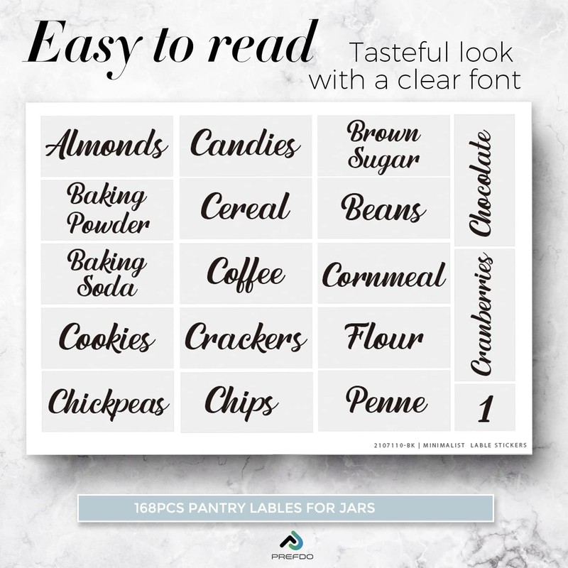 - PANTRY ORGANIZATION LABELS SET - Our set of 168 Preprinted Pantry Labels include food name labels, numbers stickers. These household stickers decorate storage containers to create an organized, functional and visually appealing kitchen.