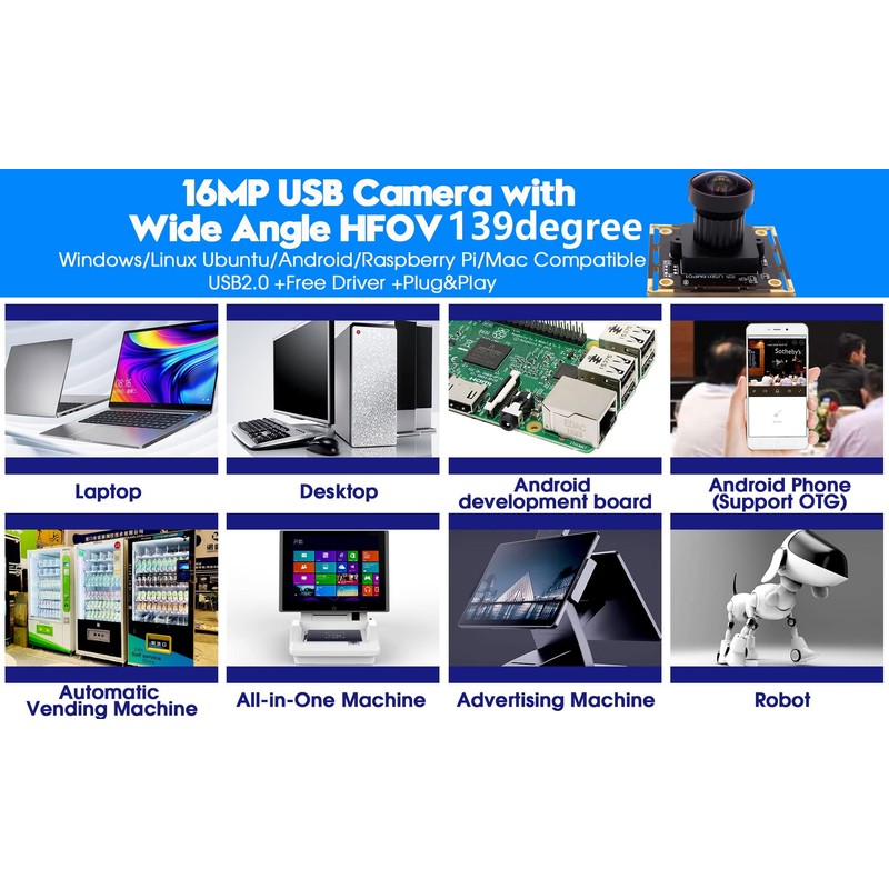 - Plug&Play: UVC compliant, just connect the camera to PC, laptop, Android device or Raspberry Pi with the included USB cable without extra drivers to be installed.
